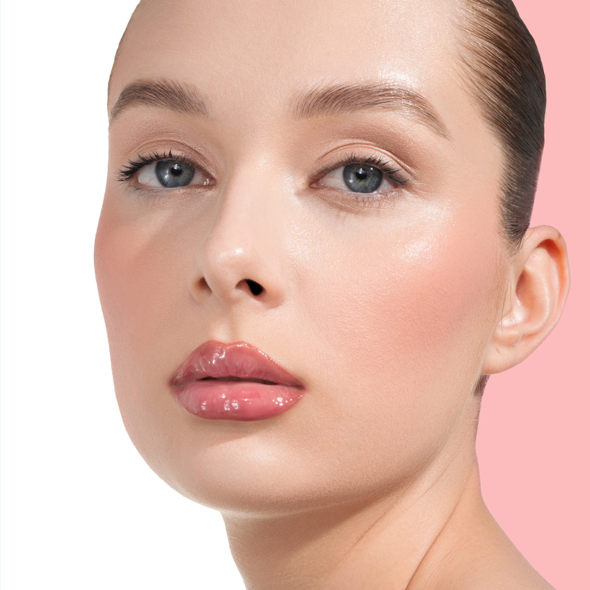 דוגמנית עם היי-גלוס בגוון 'Cherry Blossom' על רקע ורוד-בהיר ולבן.